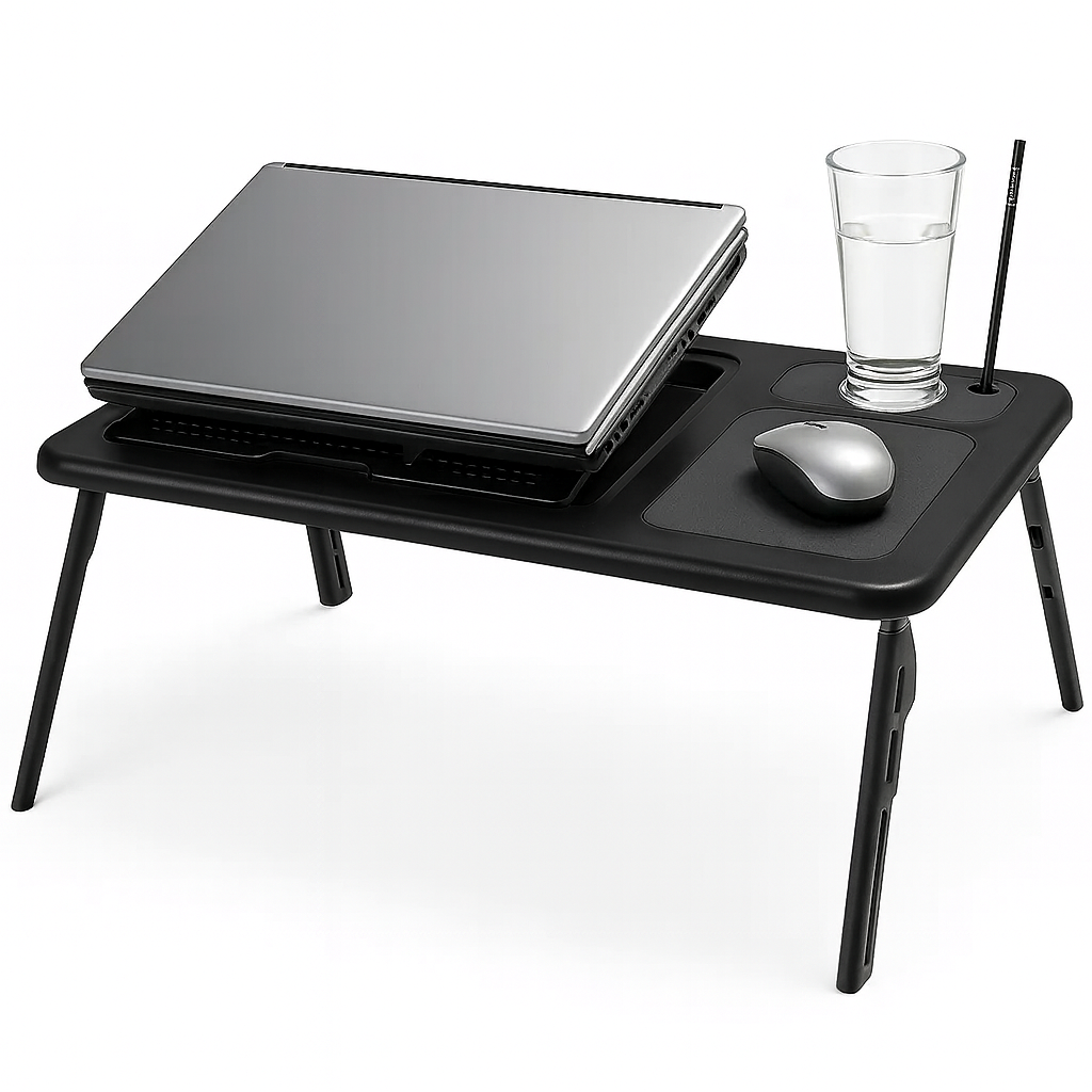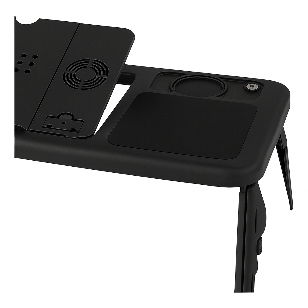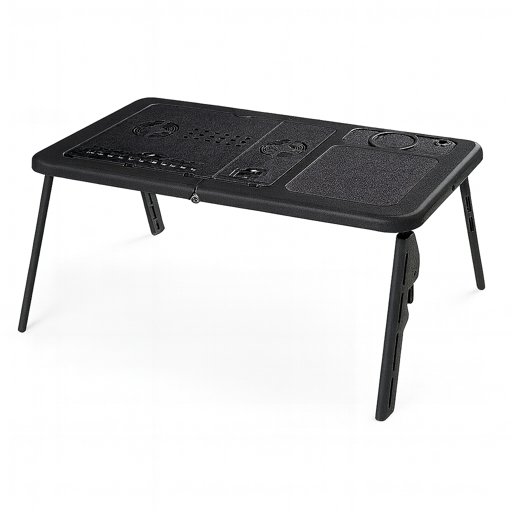 Mesa para Notebook com Cooler Características: Design ergonômico e portátil: mesa dobrável, leve e fácil de transportar, ideal para uso na cama, sofá ou até em viagens. Material resistente: fabricada em plástico de alta durabilidade com acabamento em cinza médio e detalhes em preto. Superfície multifuncional: área ampla para notebook, espaço lateral para mouse e suporte para copo ou caneta. Sistema de refrigeração: equipada com 2 coolers integrados que evitam o superaquecimento do notebook. Ajuste de inclinação: possui até 4 níveis de inclinação, garantindo maior conforto e postura adequada. Pernas dobráveis e ajustáveis: podem ser recolhidas para fácil armazenamento, ocupando pouco espaço. Benefícios: Conforto e praticidade para trabalhar, estudar ou se divertir em qualquer lugar. Melhor ergonomia, reduzindo dores nas costas e no pescoço. Maior vida útil do notebook, graças ao sistema de ventilação com coolers. Portabilidade total, podendo ser usada em ambientes internos e externos. Organização: espaço separado para mouse, caneta e bebida. O que contém na caixa: 1 Mesa dobrável multifuncional com coolers integrados. 1 Cabo USB retrátil para alimentação dos coolers. Manual de instruções. Produto ideal para quem busca praticidade, conforto e proteção para o notebook no dia a dia. As imagens são meramente ilustrativas